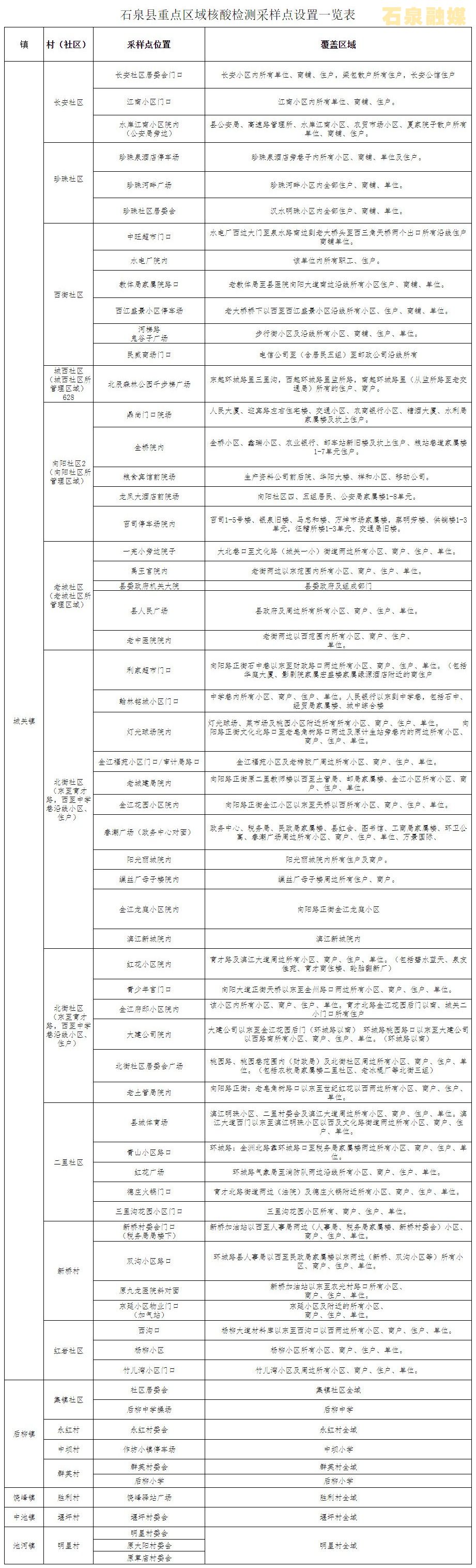 附件:石泉縣重點區(qū)域核酸檢測采樣點一覽表