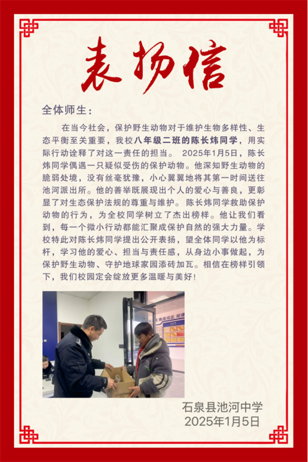 陳長(zhǎng)煒的暖心事跡傳到學(xué)校后,學(xué)校發(fā)布了表?yè)P(yáng)信,公開表?yè)P(yáng)陳長(zhǎng)煒同學(xué)的愛心善舉和保護(hù)野生動(dòng)物的暖心行為。號(hào)召全體學(xué)生要學(xué)習(xí)陳長(zhǎng)煒的愛心、責(zé)任和擔(dān)當(dāng),從小事做起,從自身做起,保護(hù)野生動(dòng)植物,為保護(hù)地球家園、尊重生態(tài)文明的多樣性貢獻(xiàn)力量。