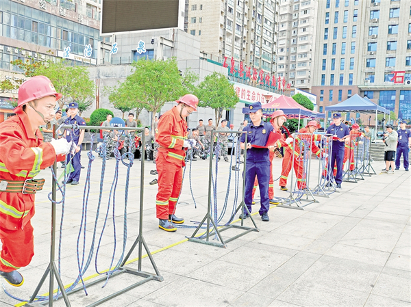 “應(yīng)急通信與拋投設(shè)備”科目賽場(chǎng),科技含量高。無(wú)人機(jī)騰空而起,飛向模擬的7樓窗口查看電話號(hào)碼,衛(wèi)星電話迅速撥通,接收考官指令;拋投器精準(zhǔn)發(fā)射,命中目標(biāo)區(qū)域。