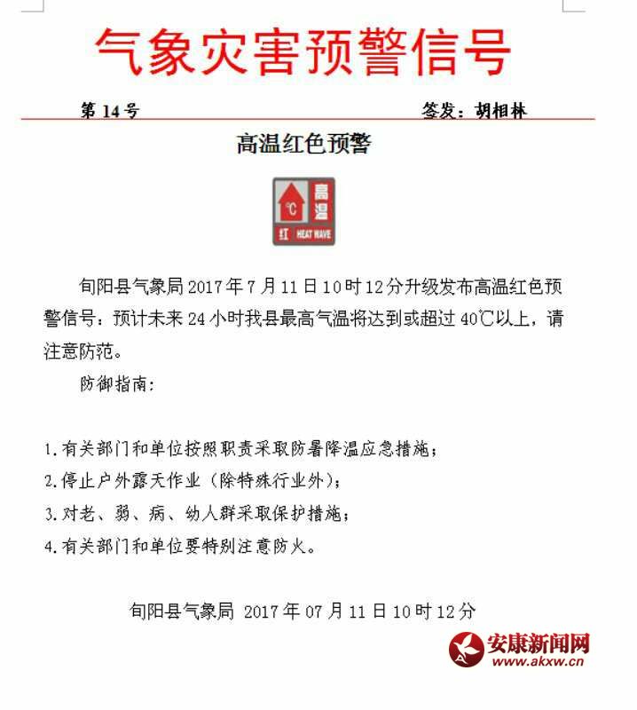 安康新聞網(wǎng)訊(通訊員 錢夢莉)旬陽縣氣象局2017年7月11日10時12分升級發(fā)布高溫紅色預(yù)警信號:預(yù)計(jì)未來24小時我縣最高氣溫將達(dá)到或超過40℃以上,請注意防范。