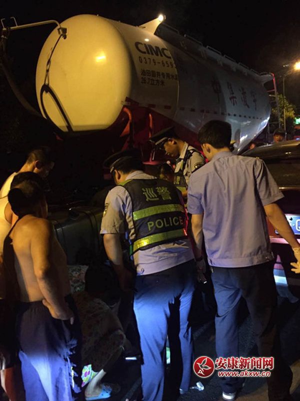 7月21日晚23時許,旬陽縣公安局巡警大隊康華園巡邏民警接到過路的群眾報警,稱:城區(qū)周家溝附近有交通事故,可能有人受傷。民警立即趕往事發(fā)地點,沿途發(fā)現(xiàn)交通以堵塞,長長的車隊一眼望不到頭,趕到事發(fā)地點后,發(fā)現(xiàn)一油罐車車底躺著兩個人,一男一女系夫妻關(guān)系,女子的腿部受傷嚴(yán)重,不能移動,當(dāng)民警趕到現(xiàn)場后,交警以及救護車隨后趕到,巡邏民警配合救護人員將躺在油罐車下的兩人救出,及時送往醫(yī)院救治。