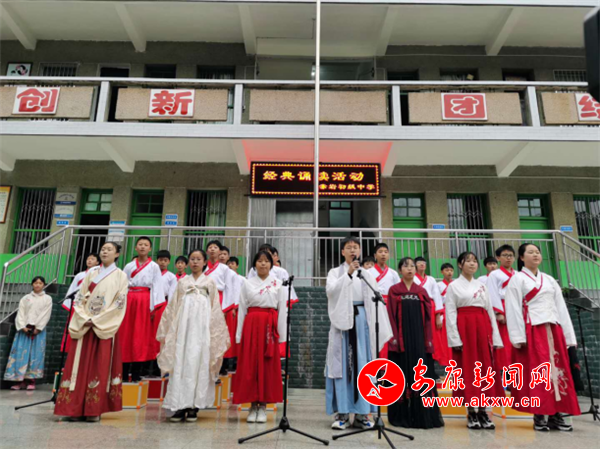 該校在抓學(xué)生閱讀的同時(shí)更注重學(xué)生對經(jīng)典篇目的誦讀和傳承。每周一早上在升旗儀式后舉行經(jīng)典篇目的誦讀,學(xué)生參與率達(dá)到百分百。各班發(fā)揮才智,形式多樣,有個(gè)人領(lǐng)讀、集體誦讀,更有班級通過演唱、戲曲、話劇等形式演繹經(jīng)典。
