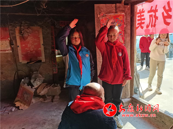 “走進(jìn)劉爺爺?shù)男≡鹤,我第一眼就看到了爺爺炯炯有神的眼睛。看見我們來了,他非常高興,笑得合不攏嘴,非常熱情地連聲照顧我們。”走在隊伍最前面的來自趙灣中學(xué)八一中隊的楊必瑞興奮地說道。她不僅是幾位第二次來拜訪志愿軍老戰(zhàn)士劉剛乾中的一員,也是本次尋訪活動的小主持人。