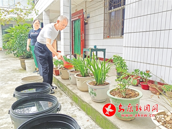 王清芬夫婦用淘米、洗菜水澆花