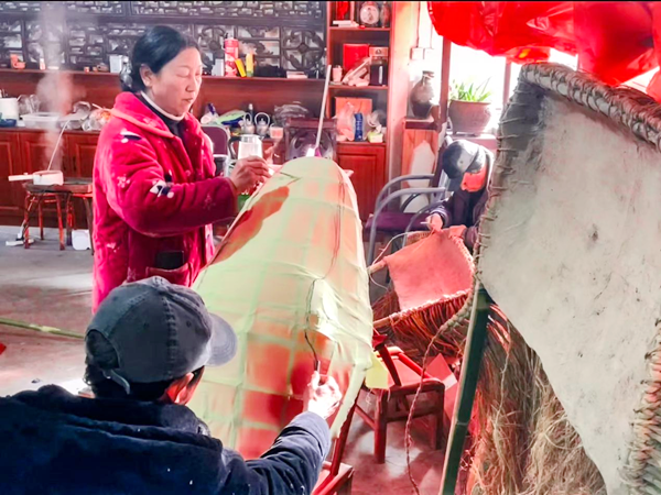 “龍頭是整條龍的重點,刻畫要逼真,色彩還得鮮艷。忙碌了一年的鄉(xiāng)親們,就希望在正月里,抖擻精神,舞動起來。”說話間,李忠寶一雙巧手上下翻飛,正在修剪龍頭花燈的胡須,忙得額頭沁出了汗珠。兒子李石磊則忙著幫烤、粘、填、糊、上色……在他們父子倆的精雕細琢下,一個威風凜凜、栩栩如生的花燈道具龍頭,總算扎制完成。