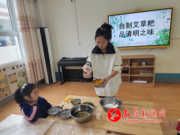 幼兒園組織家長(zhǎng)和幼兒走進(jìn)自然,一起踏青采蒿,孩子們?cè)賹⒃牧蠋У綄W(xué)校;顒(dòng)中,老師通過(guò)直觀形象的圖片、生動(dòng)有趣的視頻向孩子們講解清明節(jié)的來(lái)歷、風(fēng)俗習(xí)慣以及蒿子粑粑的制作方法,接著,孩子們?cè)诶蠋煹囊龑?dǎo)下,清洗蒿子,真真切切地體驗(yàn)了“做蒿子粑粑”的全過(guò)程。