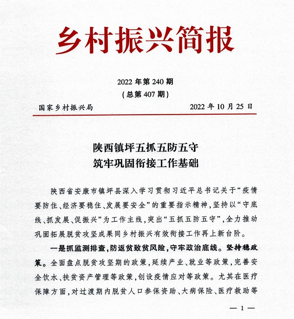 國(guó)家鄉(xiāng)村振興局簡(jiǎn)報(bào)2022年第240期刊發(fā)《陜西鎮(zhèn)坪:五抓五防五守 筑牢鞏固銜接基礎(chǔ)》,全文如下: