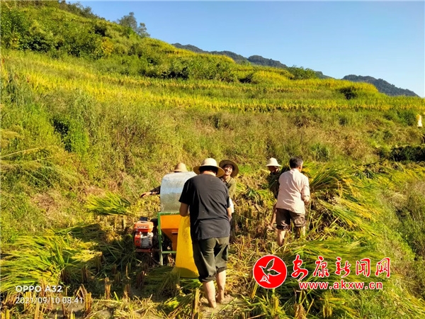 本網(wǎng)訊(通訊員 陳萌茹)稻谷收割季處處豐收景。金秋九月,秋風(fēng)送爽,正是水稻收獲的季節(jié)。紫陽(yáng)縣洄水鎮(zhèn)連橋村的稻田地里,成片黃澄澄的稻田延至天際。近日,筆者來(lái)到紫陽(yáng)縣洄水鎮(zhèn)連橋村,看到大片的水稻已經(jīng)開(kāi)始收割。NEB安康新聞網(wǎng)