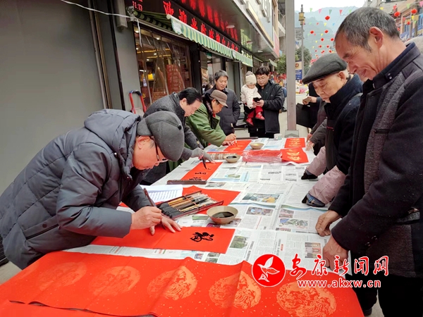 在一長排擺放整齊的寫字桌前,圍滿了來自四面八方的上百名群眾,個個喜氣洋洋,爭先認領自己心儀的過年春聯(lián)。“春回大地龍翔九天,福滿人間鳳舞五福。橫批:龍年行大運”。一幅幅吉祥喜慶、一句句恩澤華夏的美好祝愿被老百姓爭先領取。