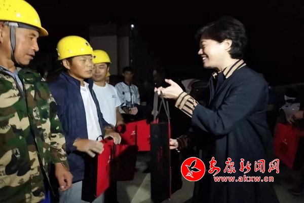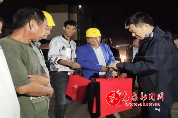 在深夜的施工現(xiàn)場,郭青向工人和基層干部送上了月餅等慰問品,對他們在中秋佳節(jié)期間依然堅守工作崗位的敬業(yè)精神和舍小家顧大家的奉獻(xiàn)精神表示崇高敬意,叮囑大家一定要注意身體健康和夜間施工安全。