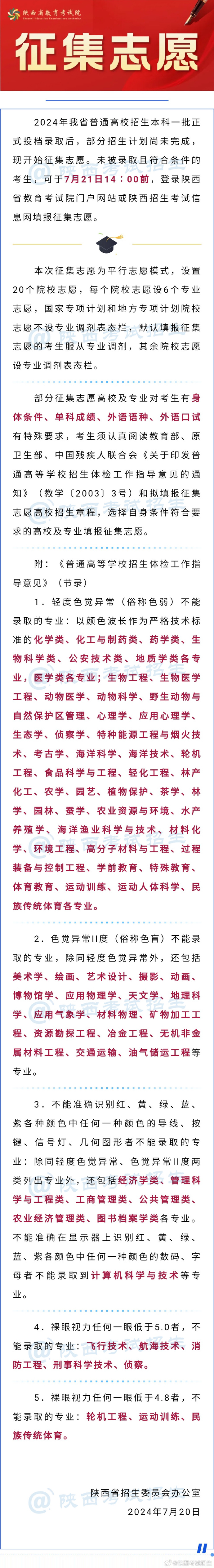 2024年我省普通高校招生本科一批正式投檔錄取后,部分招生計(jì)劃尚未完成,現(xiàn)開始征集志愿。未被錄取且符合條件的考生,可于7月21日14∶00前,登錄陜西省教育考試院門戶網(wǎng)站或陜西招生考試信息網(wǎng)填報(bào)征集志愿。F2b安康新聞網(wǎng)