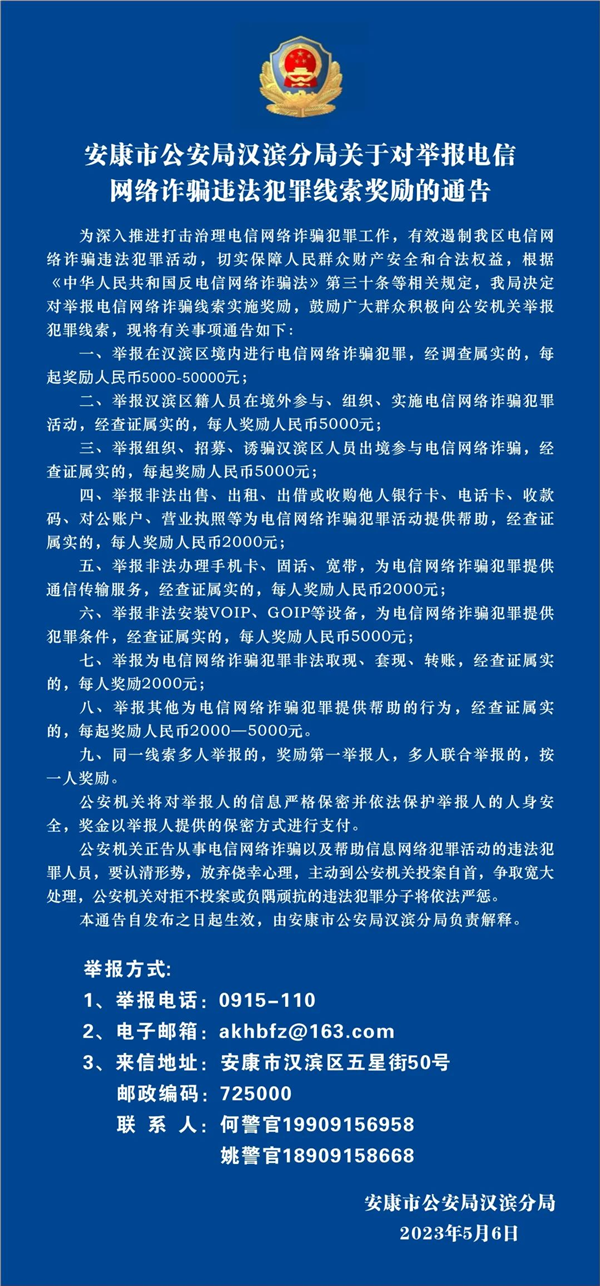 安康市公安局漢濱分局關(guān)于對舉報電信網(wǎng)絡(luò)詐騙違法犯罪線索獎勵的通告