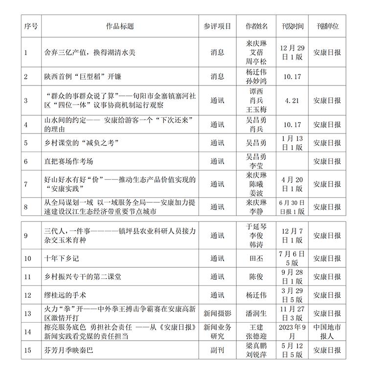 經(jīng)過1月30日編委會推薦、社黨委研究決定,擬推薦以下15件新聞作品參評2023年度“陜西新聞獎”。公示時間從2024年1月31日至2024年2月5日,公示期為5個工作日。如有不同意見,請向安康日報社機(jī)關(guān)紀(jì)委、新聞管理部反映。Fb5安康新聞網(wǎng)