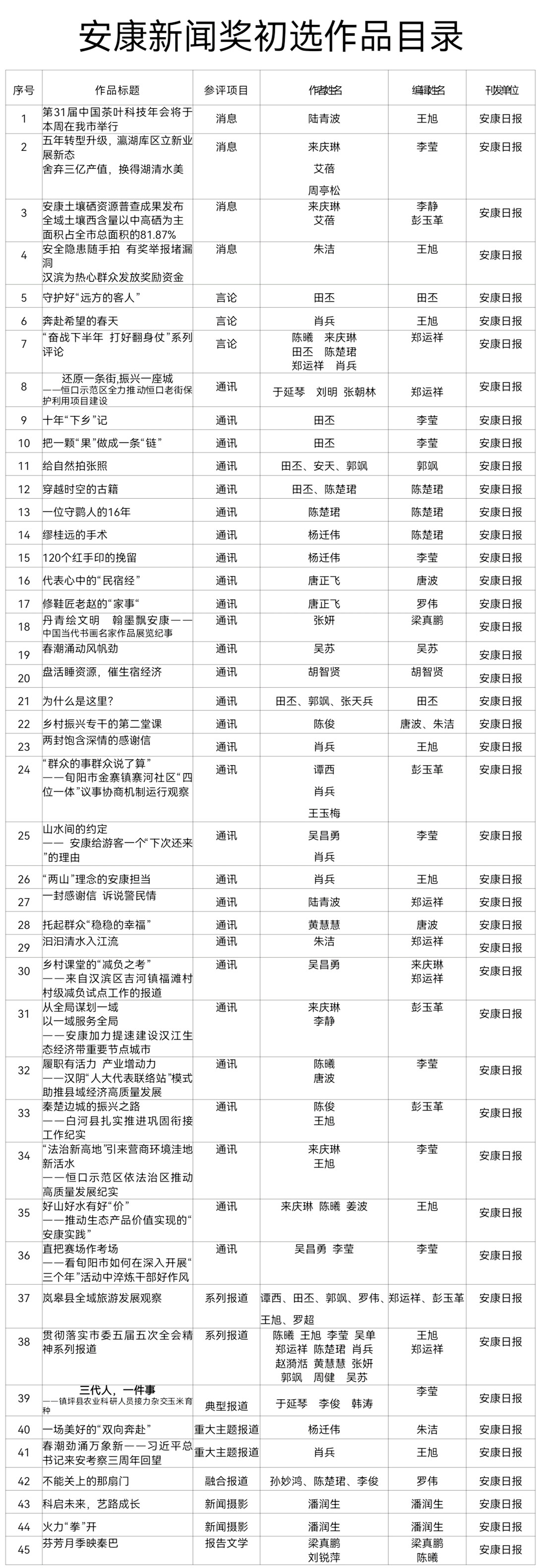 經(jīng)過3月20日編委會推薦、社黨委研究決定,擬推薦以下45件新聞作品參評2023年度“安康新聞獎”。公示時間從2024年3月21日至2024年3月27日,公示期5個工作日。如有不同意見,請向安康日報社機關紀委、新聞管理部反映。waq安康新聞網(wǎng)