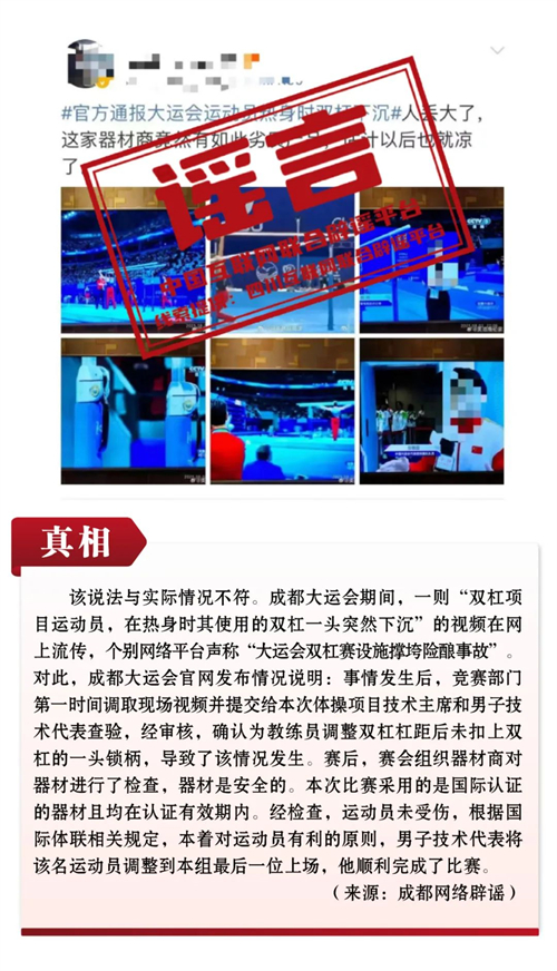 謠言8:成都大運(yùn)會(huì)雙杠賽設(shè)施撐垮險(xiǎn)釀事故?