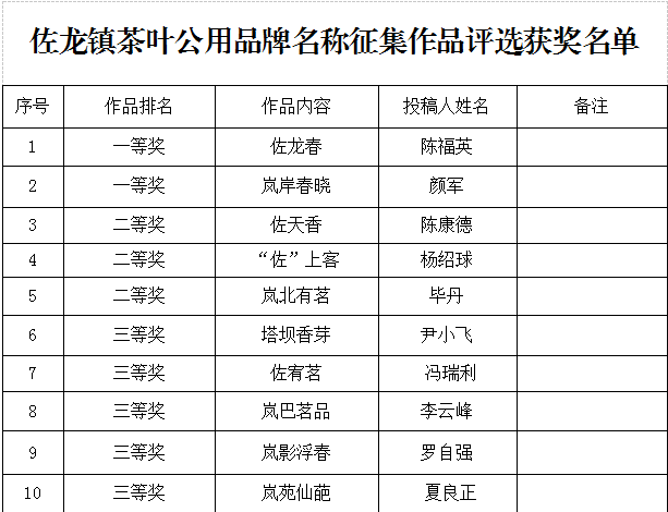 嵐皋縣佐龍鎮(zhèn)黨委、鎮(zhèn)政府在安康日報、安康新聞網(wǎng)發(fā)布《佐龍鎮(zhèn)有獎?wù)骷枞~公用品牌名稱及廣告語公告》以來,得到社會各界人士的積極響應(yīng)和支持。本次收集到的所有作品,佐龍鎮(zhèn)安排專人逐一按時間順序統(tǒng)一排序備選,經(jīng)組委初選、專家評選,已評選出獲獎作品擬予以獎勵,現(xiàn)將擬獲獎名單進(jìn)行公示,其中一等獎2名,二等獎3名,三等獎5名,優(yōu)秀獎66名,公示時間自發(fā)布之日起至2021年12月31日17時。擬獲獎名單如下: