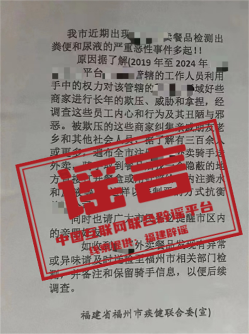 謠言:“福建省福州市疾健聯(lián)合委”發(fā)文稱“某外賣平臺餐品檢出糞便和尿液”?