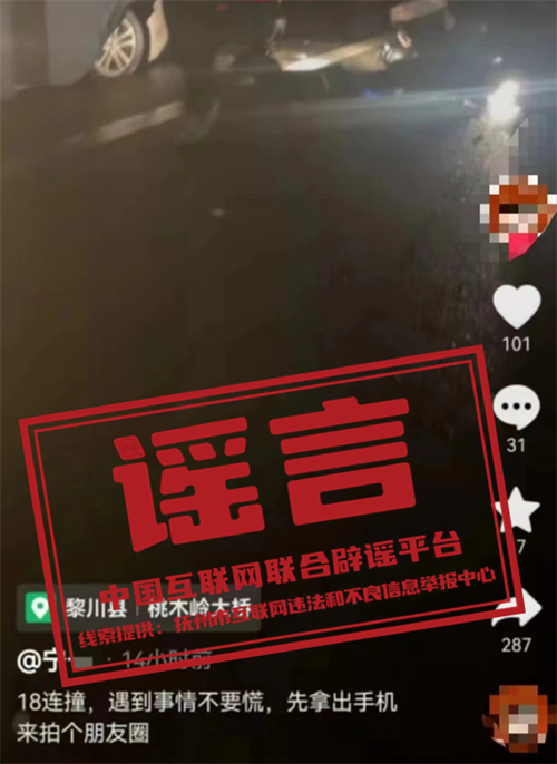 真相:近日,有網(wǎng)民在某網(wǎng)絡(luò)平臺發(fā)布“江西黎川境內(nèi)福銀高速贛閩交界處發(fā)生一起18車連撞重大交通事故”的視頻。經(jīng)向?qū)俚馗咚俳痪藢,黎川高速路段并未發(fā)生18車連撞事故,該視頻信息系謠言。目前,警方已依法對散布網(wǎng)絡(luò)謠言視頻者予以行政處罰,并責令其刪除相關(guān)不實視頻。(來源:“撫州網(wǎng)警”微信公眾號)