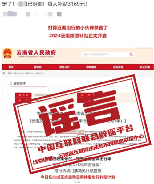 謠言:去云南旅游每人補貼3169元?