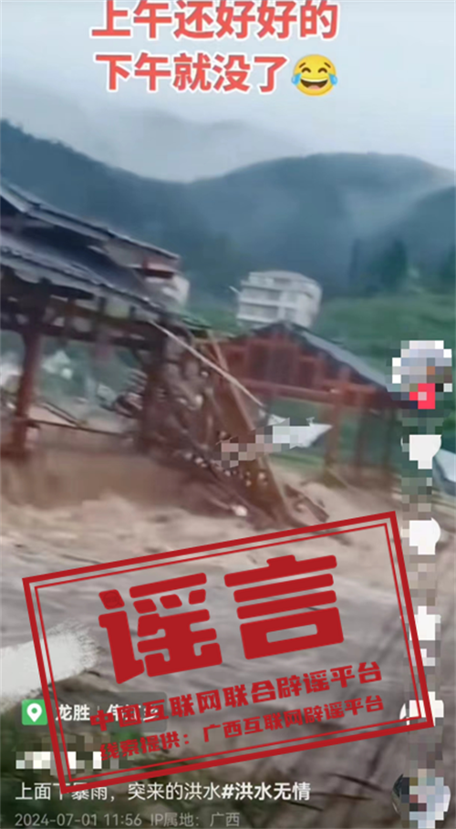 詳情:近日,有網(wǎng)民發(fā)布視頻稱“桂林龍勝一風雨橋被洪水沖毀”,并配文“上午還好好的,下午就沒了”,引發(fā)關注。經(jīng)當?shù)毓膊块T核實,偉江鄉(xiāng)轄區(qū)內(nèi)風雨橋完好無損,不存在倒塌的情況。該視頻系當?shù)鼐W(wǎng)民龍某某罔顧事實、故意編造,將網(wǎng)上看到的其他地方的風雨橋被毀視頻重新編輯并定位在偉江鄉(xiāng)進行發(fā)布。目前,警方已依法對龍某某予以行政處罰。(來源:廣西互聯(lián)網(wǎng)辟謠平臺、龍勝公安)