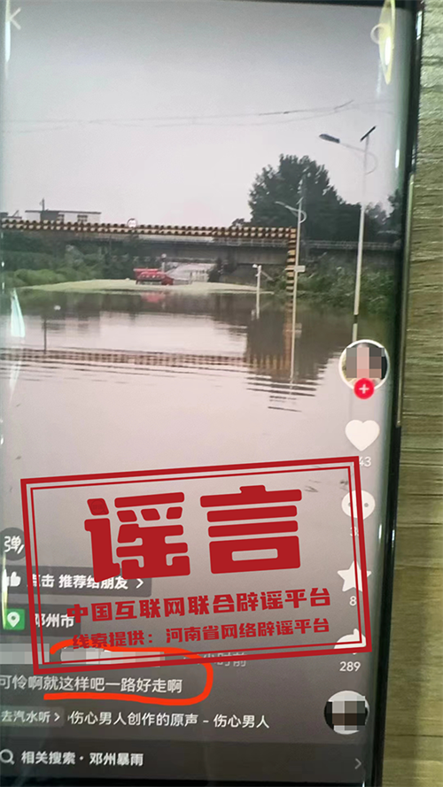 7月15日,網(wǎng)民“神x”在某短視頻平臺發(fā)布“貨車司機被淹”視頻,并配文稱“可憐啊,就這樣吧,一路好走”。經(jīng)核實,7月14日,鄧州市鐵路橋下一外地牌照貨車被淹,車內(nèi)被困人員已被成功救出,無人員傷亡,該信息與事實嚴重不符,系虛假信息。