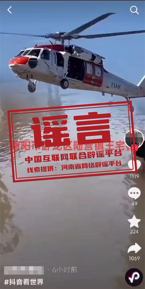 7月15日,網(wǎng)民“賓利xx”在某短視頻平臺發(fā)布視頻稱“南陽市臥龍區(qū)陸營鎮(zhèn)王莊村被水淹,臥龍區(qū)使用直升機進行救援”。經(jīng)核實,臥龍區(qū)未使用直升機進行救援,視頻是發(fā)布者使用軟件拼接而成,系虛假信息。