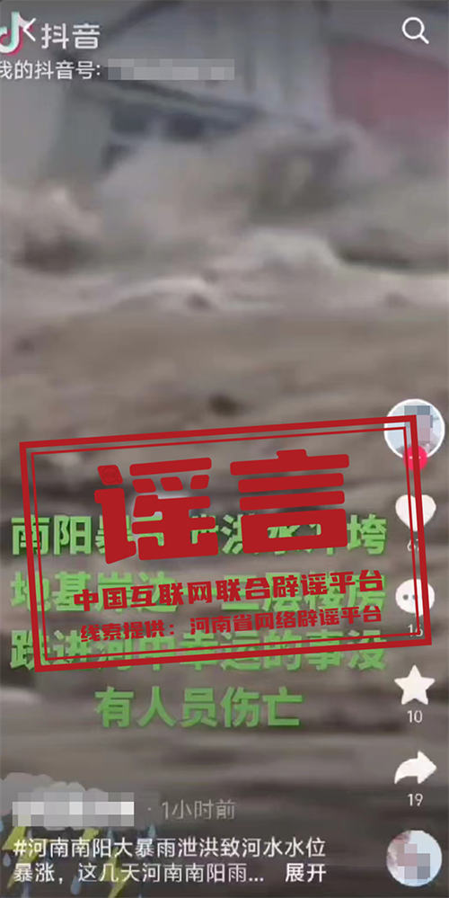 7月15日,網(wǎng)民“憶思xx”在某短視頻平臺發(fā)布視頻稱“南陽暴雨泄洪,水沖垮地基,岸邊一三層樓房跌進河中,幸運的是沒有人員傷亡”。經(jīng)核實,南陽此次暴雨未發(fā)生房屋被沖塌事件,該視頻為2021年某地暴雨泄洪,致河水水位上漲,岸邊3層樓房轟然倒塌視頻,并非近日發(fā)生的汛情。