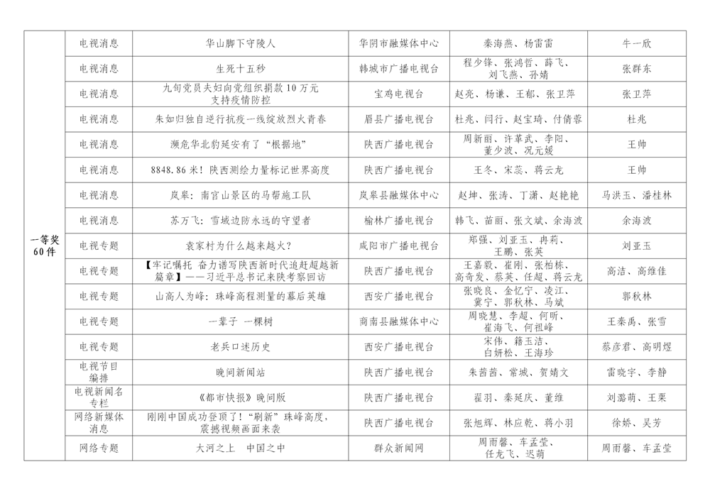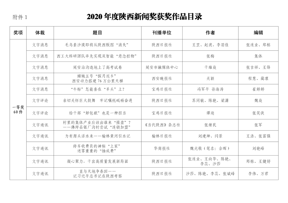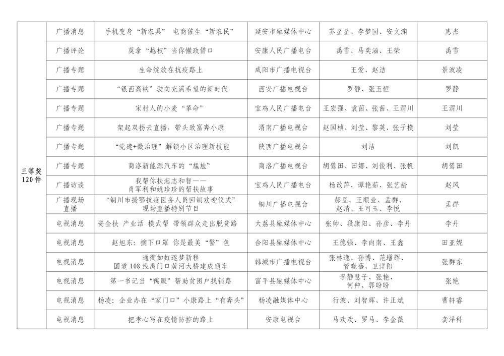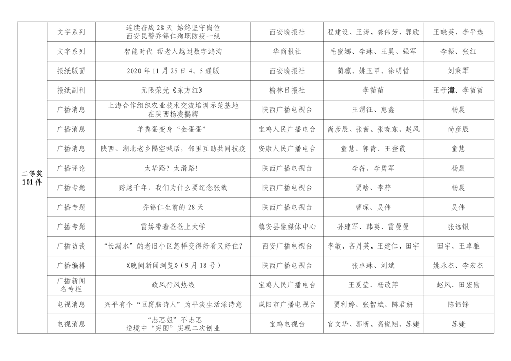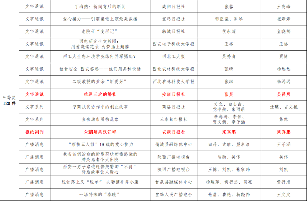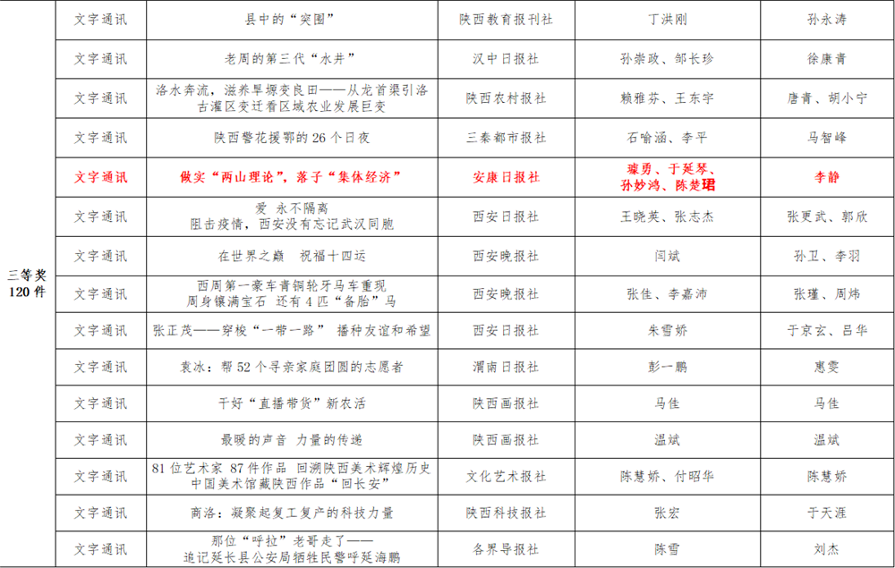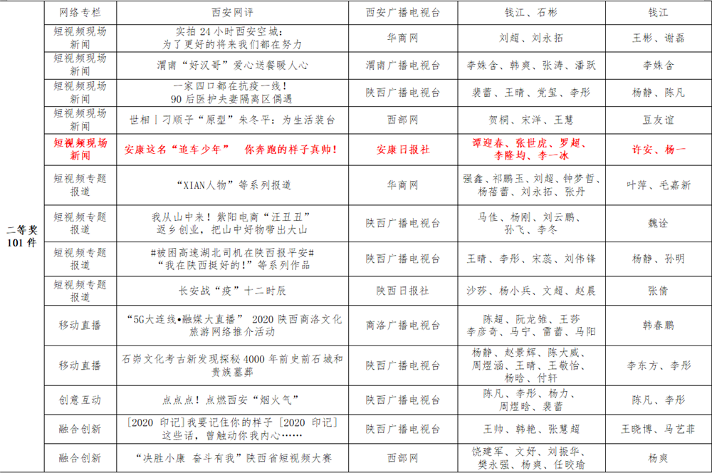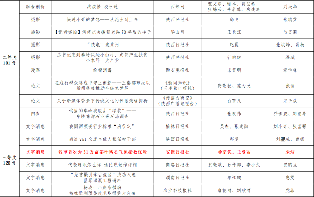 7月6日,陜西省新聞工作者協(xié)會(huì)公布了2020年度陜西新聞獎(jiǎng)、陜西省優(yōu)秀新聞工作者評選結(jié)果,最終評定2020年度陜西新聞獎(jiǎng)獲獎(jiǎng)作品281件,其中一等獎(jiǎng)作品60件、二等獎(jiǎng)作品101件、三等獎(jiǎng)作品120件;10件作品獲2020年度陜西新聞獎(jiǎng)“中央、省外媒體特別獎(jiǎng)”;12名新聞工作者獲得陜西省優(yōu)秀新聞工作者稱號。Ynz安康新聞網(wǎng)