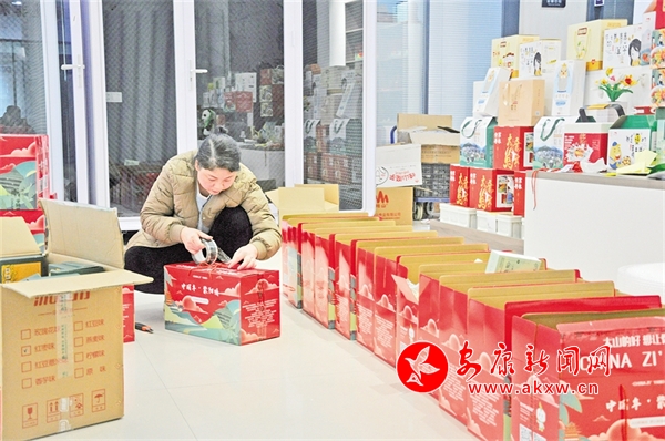 春節(jié)臨近,紫陽蒸盆子和年貨大禮包通過電商走進了萬戶百姓家。目前已銷售紫陽蒸盆子4萬份,年貨大禮包1000余份。圖為工作人員在打包發(fā)貨。彭召伍 攝