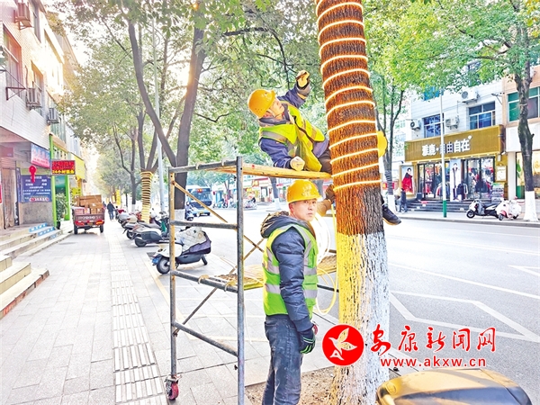 石泉縣為營(yíng)造絢麗多彩的城市夜景,在向陽(yáng)大道兩旁的景觀樹上安裝LED燈帶。楊勇 攝