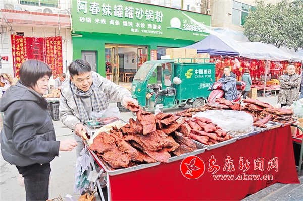 在嵐皋縣城興隆街、建設(shè)路農(nóng)貿(mào)市場(chǎng),臘肉、香腸、臘排骨、臘豬蹄、血豆腐等等紛紛亮相,為市民提供了豐富的年貨。廖霖 攝