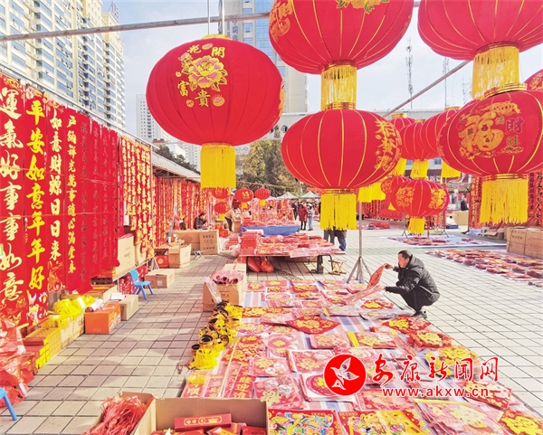 商販在中心廣場(chǎng)售賣春聯(lián)、福字、紅燈籠等節(jié)慶用品。吳定國(guó) 攝