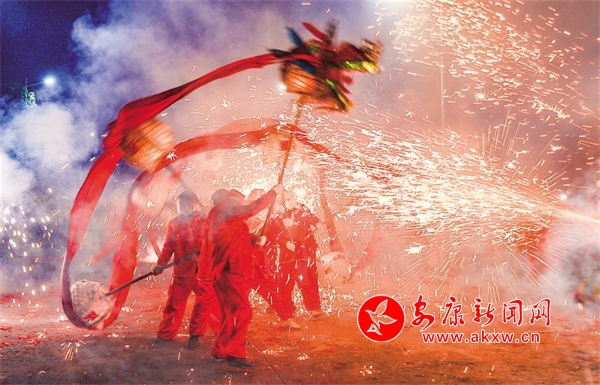 五里工業(yè)園區(qū)的“燒火龍”表演蔚為壯觀。李成寶 攝