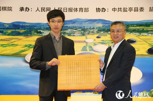 現(xiàn)任“名人”連笑向袁明贈(zèng)送簽名棋盤