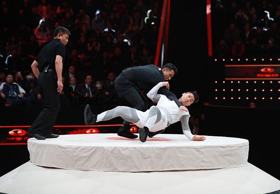 推下擂臺(tái),背部著地,雙雙摔出場外……兩位70公斤級(jí)選手率先登場,剛?cè)岵?jì)中體現(xiàn)力量與技巧,比賽節(jié)奏緊張、勝負(fù)扣人心弦。豐富的技術(shù)動(dòng)作,復(fù)雜的勁道變化,讓熟悉跆拳道、柔道和拳擊的觀眾,見識(shí)了不同于摔、打、踢的太極技擊,現(xiàn)場歡呼加油聲不斷。
