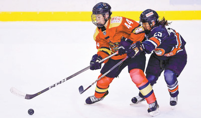 | 12月10日,深圳昆侖鴻星隊球員(左)和深圳萬科陽光隊球員在CWHL(加拿大女子冰球聯(lián)賽)常規(guī)賽比賽中拼搶。 |