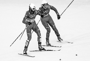 2月21日,平昌冬奧會越野滑雪女子團(tuán)體短距離自由技術(shù)半決賽在阿爾卑西亞滑雪中心進(jìn)行。由池春雪和李馨組成的中國隊以17分35.94秒的成績排名B組第九無緣決賽。圖為池春雪(右)與李馨在半決賽中。 本報特派記者 魏征攝