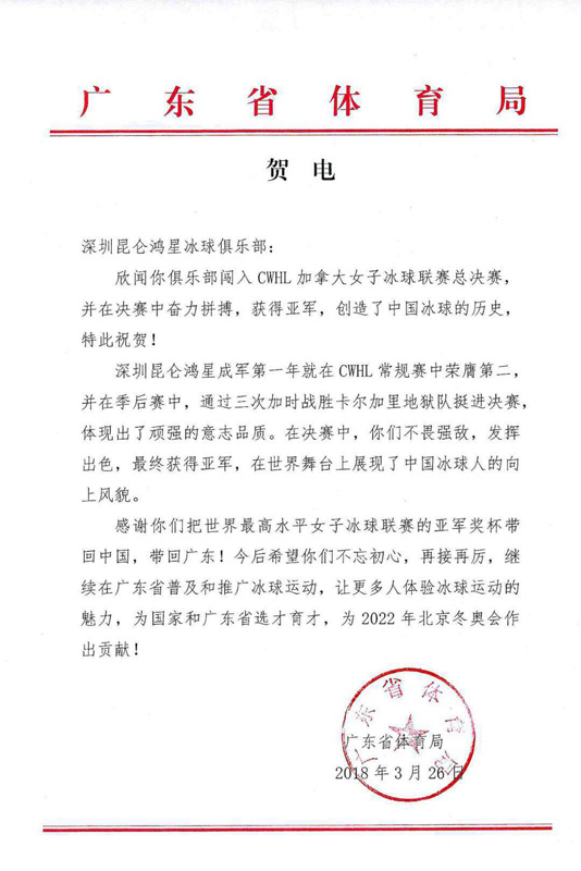 人民網(wǎng)3月26日電 北京時(shí)間3月26日零時(shí),CWHL(加拿大女子冰球職業(yè)聯(lián)賽)克拉克森杯總決賽打響,由深圳昆侖鴻星對(duì)戰(zhàn)萬錦迅雷隊(duì)。本場(chǎng)比賽,昆侖鴻星第一節(jié)先失一球,第二節(jié)由史塔克將比分扳平。加時(shí)賽中,萬錦迅雷隊(duì)斯塔西打入絕殺球,最終昆侖鴻星以1-2加時(shí)憾負(fù)萬錦迅雷隊(duì),但獲得亞軍仍然是中國(guó)冰球在世界頂級(jí)冰球職業(yè)聯(lián)賽中取得的最好成績(jī)。賽后,廣東省體育局發(fā)來賀電,對(duì)深圳昆侖鴻星奪得CWHL亞軍表示祝賀。賀電全文如下: