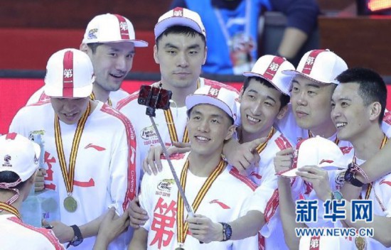 ↑遼寧隊(duì)球員在頒獎(jiǎng)儀式上自拍新華社記者王東震攝