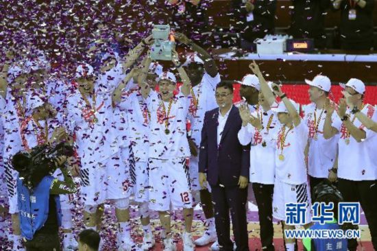 ↑遼寧隊(duì)球員在頒獎(jiǎng)儀式上慶祝奪得總冠軍新華社記者王東震攝