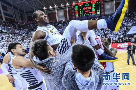 ↑遼寧隊(duì)球員在賽后將隊(duì)友哈德森(上)拋起,慶祝奪冠新華社記者潘昱龍攝