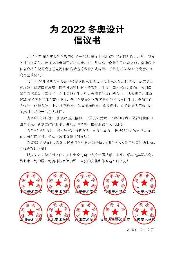 ↑中央美術(shù)學(xué)院、中國美術(shù)學(xué)院等十所全國各地美術(shù)學(xué)院7日在北京共同發(fā)出“為2022冬奧設(shè)計”的倡議,號召大家積極投身到北京2022年冬奧會相關(guān)工作中來,參與冬奧會和冬殘奧會相關(guān)藝術(shù)設(shè)計項目中。圖為倡議書,由中央美術(shù)學(xué)院提供。