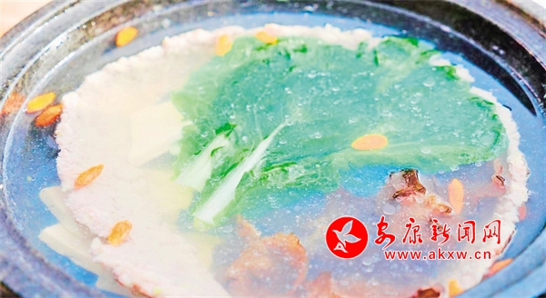 “白火石汆湯是我跟我祖父和父親學(xué)的手藝,13歲開始學(xué)做廚,白火石汆湯里面主要用到新鮮的豬肉,加蔥姜、蛋清、鹽、雞精以及料酒、生粉、蛋清,將其剁成肉泥,貼到陶盆里面,上厚下薄,里面陸續(xù)放上木耳、小青菜、豆腐,然后把石頭燒紅之后放進陶盆內(nèi)的紗布中,只消幾分鐘,一道美味可口的白火石汆湯便做好了。”解遠(yuǎn)平一邊準(zhǔn)備食材,一邊向筆者介紹著白火石汆湯的做法。