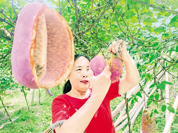 遠嫁安徽的漢濱區(qū)雙龍鎮(zhèn)謝坪村魏澤會,在外打拼一生,年逾花甲思鄉(xiāng)心切,于2018年回到家鄉(xiāng),在老家附近的一條山溝里,栽種了30畝八月炸。今年,八月炸喜獲豐收。走進園區(qū),一行行、一架架八月炸藤蔓,掛滿了粉紅的果實,有的裂開果肉,像極了開懷大笑的娃娃。魏澤會說:“今年產量達到3萬公斤左右,因八月炸不易保存,謝坪村第一書記汪道軒和陜西省生態(tài)廳環(huán)境信息中心駐村干部馬祥一起,先后通過網絡推介、電商促銷和臨時售賣點等幫我們銷售。”為了最大限度增收,魏澤會已嘗試利用八月炸釀酒、榨油等,均已成功,因產量很小,暫未對外銷售。