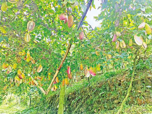 八月炸,中藥名稱“預知子”,是三葉木通的果實,果子的形狀為橢圓形,長得像香蕉,沿腹縫線略彎,又似腎臟。成熟后,露出里面乳白色的果肉,口感甜糯,似冰激凌,富含糖、維生素C和12種氨基酸以及人體不能合成的纈基酸、蛋氨酸、異亮氨酸、苯丙氨酸、賴氨酸和清熱利濕、活血通脈、行氣止痛的功效。