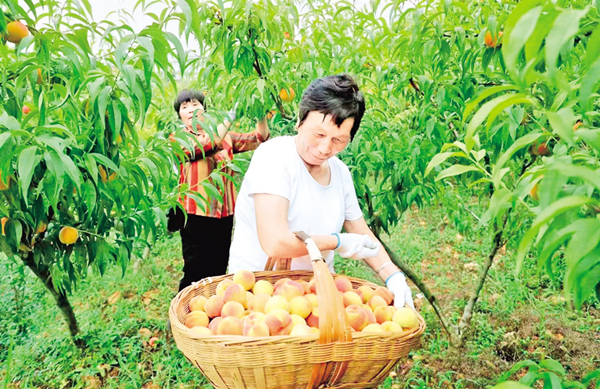 四月桃花猶在眼,而今碩果滿枝頭。眼下,正值黃桃成熟季,漢濱區(qū)關(guān)廟鎮(zhèn)文化村的300畝桃園內(nèi)一個(gè)個(gè)豐盈飽滿的黃桃掛滿枝頭,在陽(yáng)光照耀和綠葉掩映下粉嫩透紅,沁人心脾的桃香撲鼻而來(lái)。