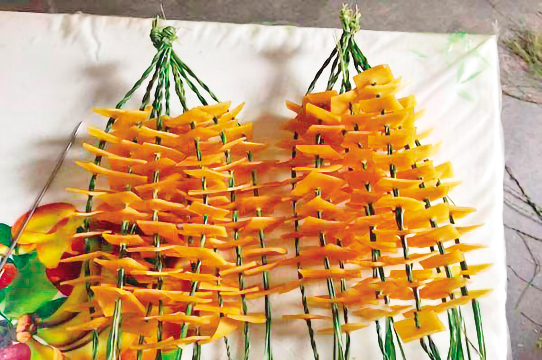兩摻面,一半豆面與一半麥面在漢江水的調(diào)和下,經(jīng)過反復(fù)搓揉摻搟,兩種面粉化作一種新的食材——兩摻面。兩摻面摻好后醒的過程中,從酸菜壇子里撈出清……