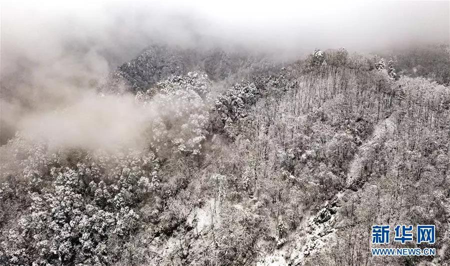 11月8日無(wú)人機(jī)拍攝的銀裝素裹的鬼谷嶺國(guó)家森林公園主峰。 新華社記者陶明攝