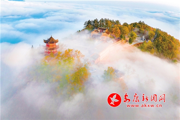 天柱山最美不過秋色,也是我在四季當中頻繁上山的季節(jié)。每逢秋天,這里紅黃綠相間,漫山掛彩,在藍天的映襯下,多了幾分浪漫。從國道211起點的兩條上山公路,由數(shù)個“之”字連接起來,從湖邊一直盤旋至山頂?shù)陌自乒潘,遠眺仿佛一個大大的“人”字形飄帶。雨后放晴的頭兩個早晨,在云霧的籠罩下,天柱山的下半身連同湖面一并被巨大的“蠶絲被”覆蓋,山的上半身或山頭浮在云海之上,像是茫茫大海上的一座孤島。