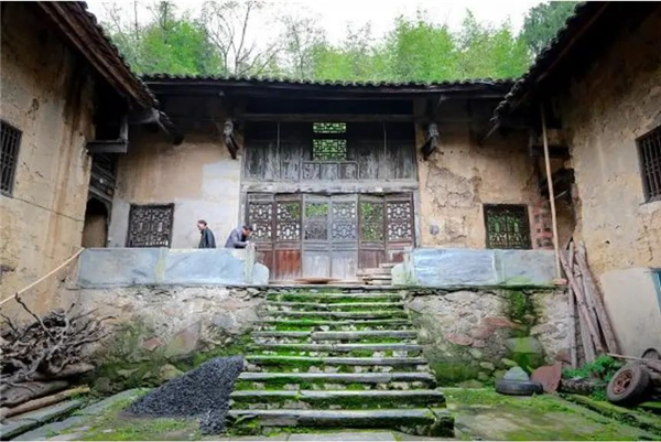 經(jīng)天井院上九步石梯到長廊,此廊為石栓石欄。正面堂屋為六開槅扇門,門窗為土木雕刻工藝,國文壽字,古銅錢、蝙蝠、冬瓜圈、梭子圈、卷草等工藝。此處為黃家紙廠議事之地,巧借地勢突出氣勢,雖只兩層,卻與兩邊三層廂房等高,借助前面的大天井采光,構(gòu)成院中府第,顯然是吸取了湖廂府衙式建筑理念。從堂屋前的過道可通往東西兩側(cè)小天井,面向大門,西側(cè)小天井因地勢縮進(jìn)2米,但建有曬樓(陽臺(tái)),雖然天井狹小,但天井里鑿內(nèi)池、留溝防、設(shè)路徑、安石碑,甚至連置盆栽種都應(yīng)有盡有,雖然時(shí)光侵蝕,破損嚴(yán)重,但遺跡清晰可辨,足見主人生活饒有情趣。